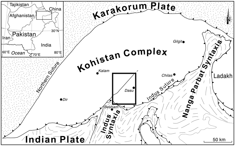 Fig. 1: Studied area (squared) located in the structural framework of Northern Pakistan, with the Kohistan Complex, main sutures and syntaxes.