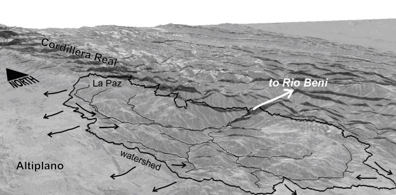 cut into the Altiplano: 1) the Rio La Paz drainage system with a total area